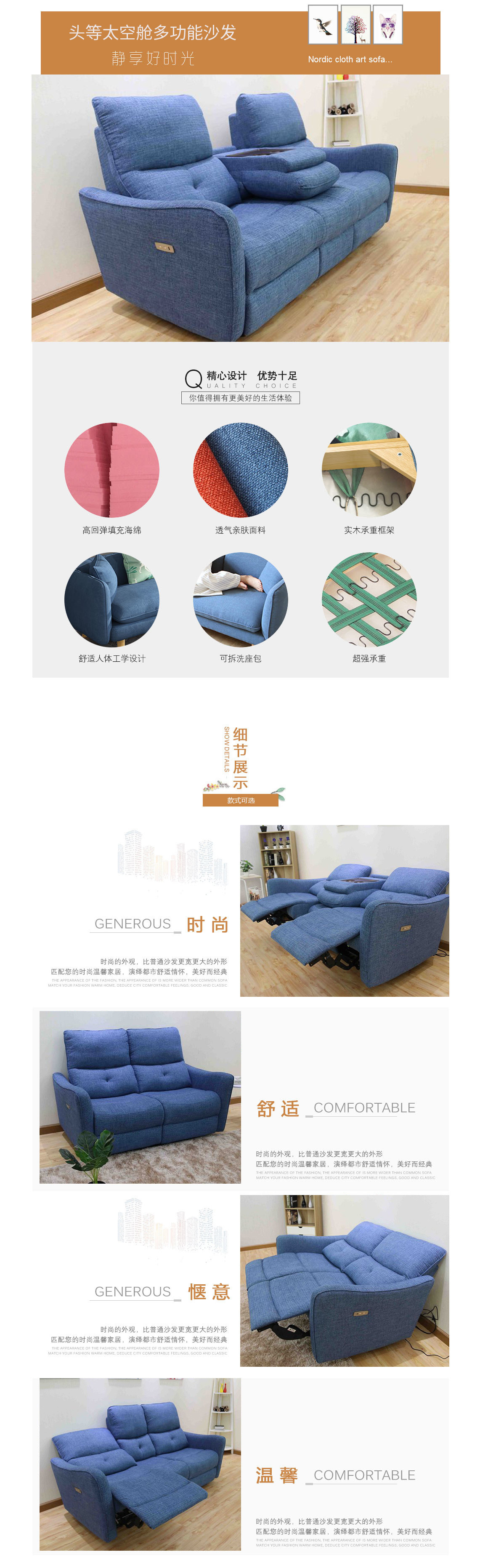 突出特点:普通电动沙发需要预留离墙5-10cm距离,此款电动沙发铁架采用最新欧美流行款式,独特 零靠墙设计,无需特意留出距离,更能满足小户型家庭使用,目前日韩特别流行此款产品,在一经推出后,收到市场强烈好评。